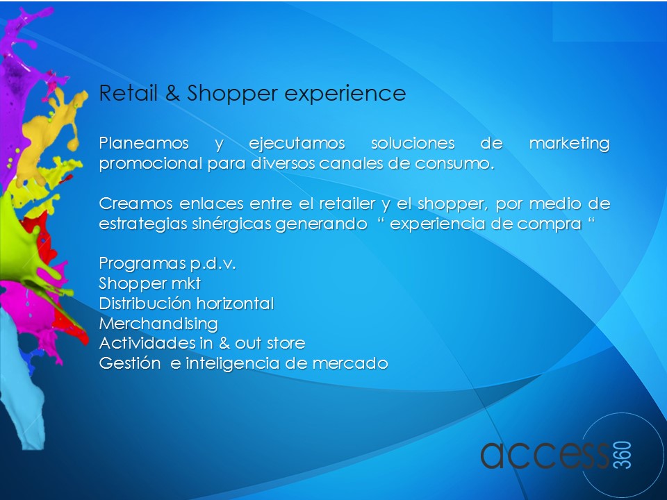 Planeamos y ejecutamos soluciones de marketing promocional para diversos canales de consumo. Creamos enlaces entre el retailer y el shopper, por medio de estrategias sinérgicas generando “ experiencia de compra “